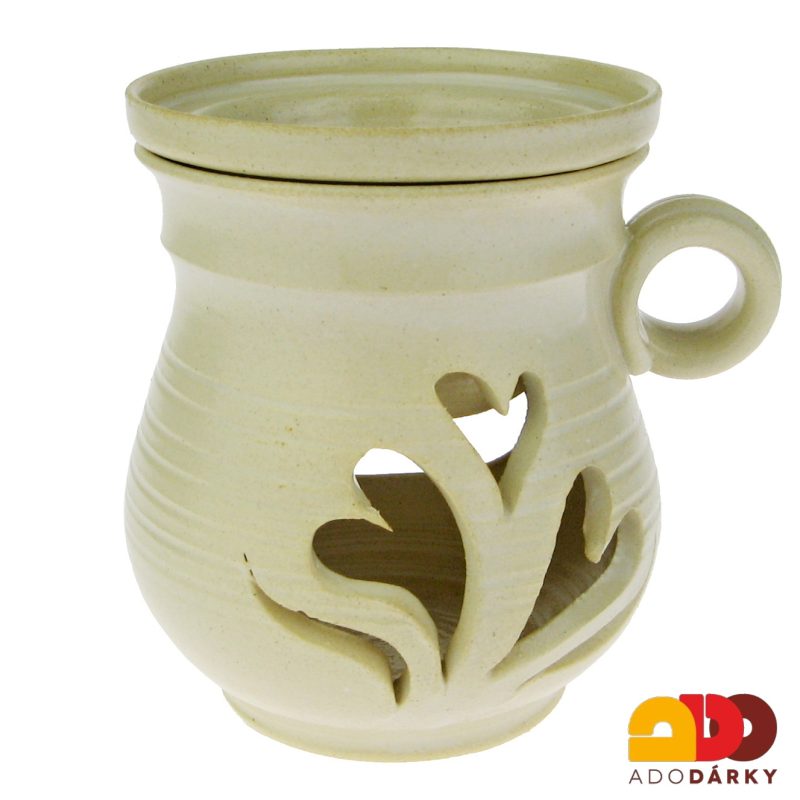 Keramická aromalampa z hnědé hlíny, glazovaná světlou glazurou, zdobená vykrojenými ornamenty. Kalíšek na olej s vodou je pro snadnější údržbu vyjímatelný. Jedná se o stylový a funkční předmět k navození té správné příjemné atmosféry.