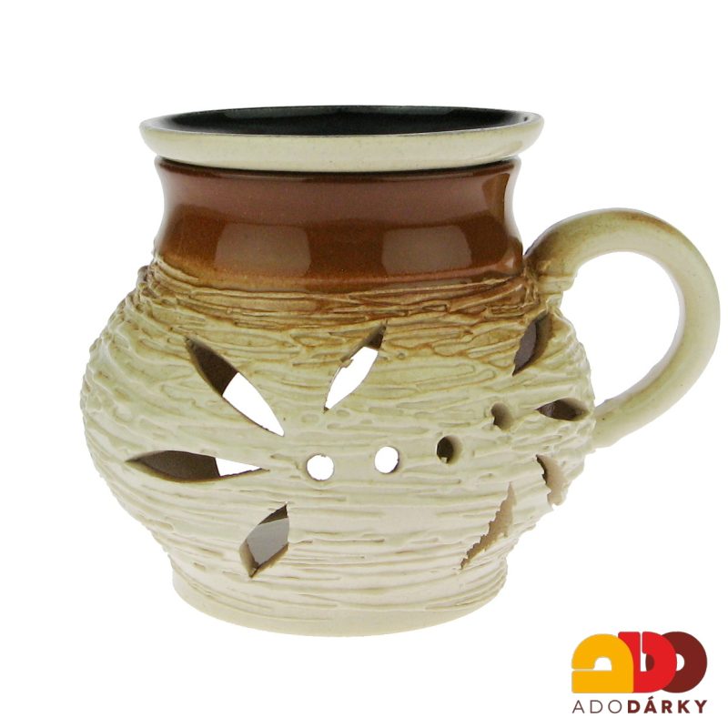 Keramická aromalampa z hnědé hlíny, glazovaná světlou glazurou a zdobená prolamováním, tedy vyraženými plamínky. Aromalampa je funkční a po zapálení svíce, nalití vody a oleje dokáže vytvořit tu správnou relaxační atmosféru.
