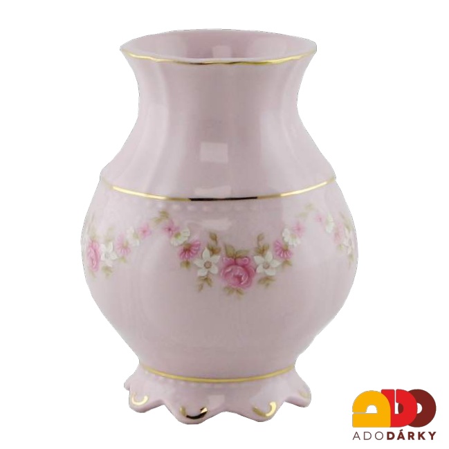 Vázička z růžového porcelánu, ručně dekorovaná 14K zlatem a potiskem květinové girlandy po stranách. Nejedná se pouze o stylovou dekoraci, ale o plně funkční produkt. Porcelán je vyráběn českou porcelánkou Leander s více než stoletou tradicí a vlastními výrobními postupy.