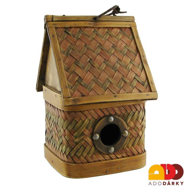 Interiérová dekorační budka pro ptáčky, vyrobená z dřeva a řezaného proutí. Tato okrasná budka se nejlépe hodí k dotvoření stylového interiéru netradičním a originálním doplňkem.