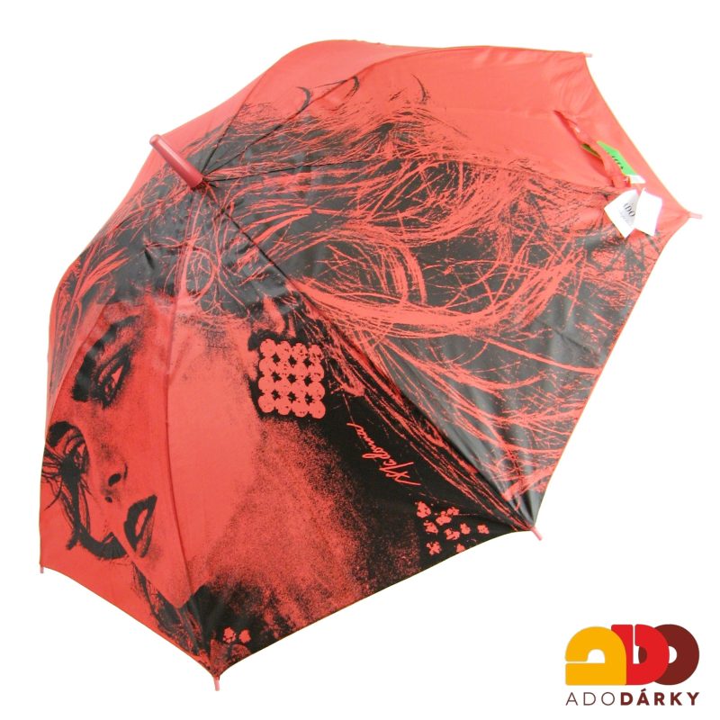Originální dámský holový deštník s červeným potahem zdobený potiskem tváře sympatické ženy. Otevírání deštníku je poloautomatické a silná pružina zajistí jeho okamžité roztáhnutí, skládání je poté ruční. Rukojeť je plastová, standartně zahnuta, špička deštníku je také plastová.