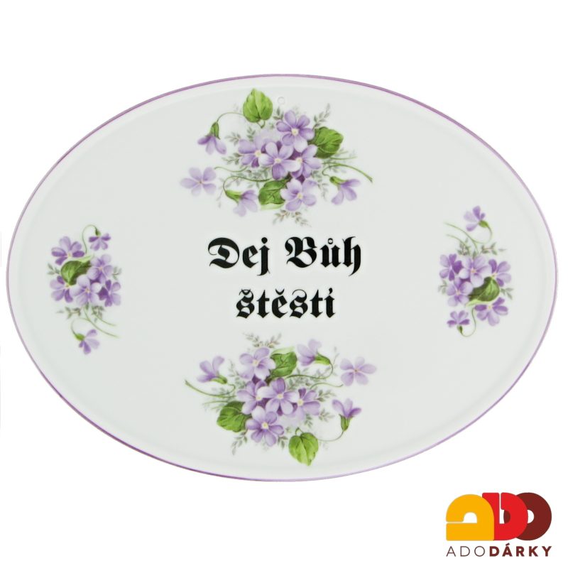 Domácí požehnání "Dej Bůh štěstí" z porcelánu, dekorováno rozkvetlými fialkami od českého výrobce Original Bohemia Zwiebelmuster z Dubí. Vyzdobte si domácnost netradičními dekoračními prvky, které Vám bude každá návstěva závidět.