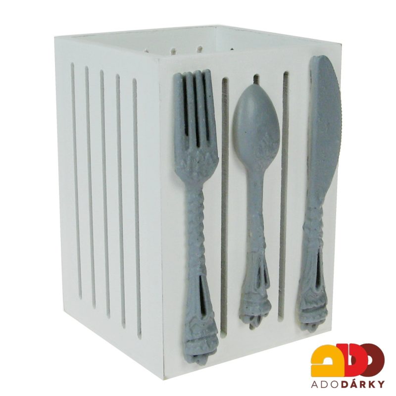 Bílý stojánek- krabička na příbory je ze dřeva a je ozdoben plastickými vyobrazenými šedými příbory. Je to krásný praktický doplněk do kuchyně.