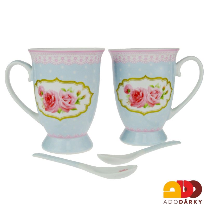 Dva porcelánové vysoké hrnky se lžičkami v dárkové krabici ve tvaru srdce. Vše včetně lžiček je dekorováno modrorůžovým dekorem s květinkami a zabaleno v dárkové krabici