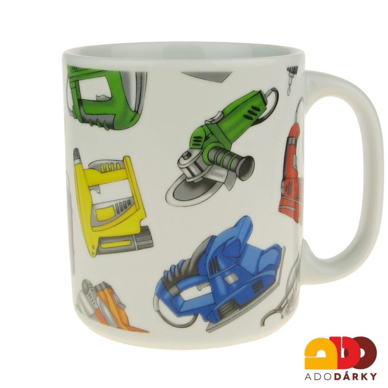 Porcelánový hrnek větší velikosti s potiskem nářadí. Hrnek má masivnější ucho, pro pevnější a bezpečnější úchop a specielně je vhodný pro kutily a pořádné chlapy.