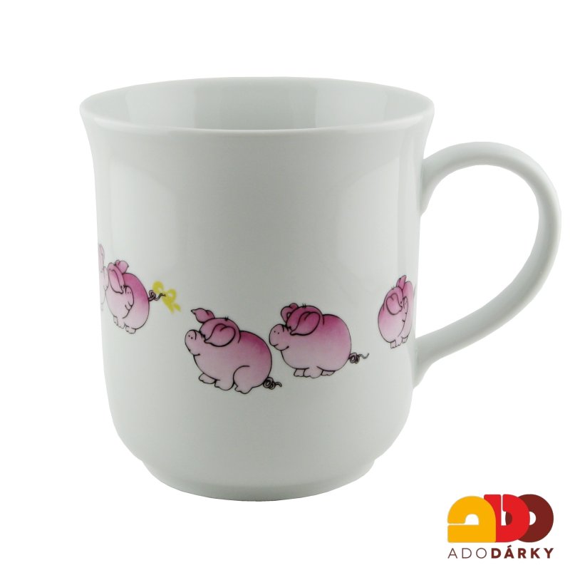 Velký porcelánový hrnek maxi rozměrů s objemem jednoho a půl litru. Hrnek je kolem dokola dekorován obrázkem roztomilých prasátek.
