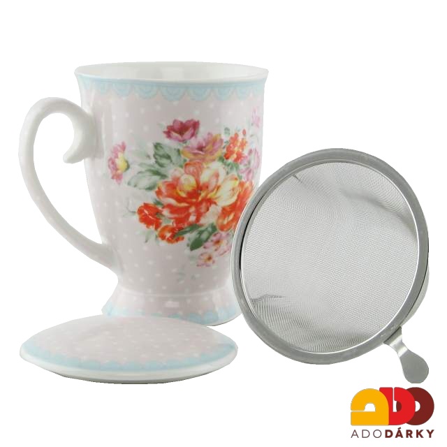 Porcelánový hrnek na bylinky s kovovým sítkem a porcelánovým víčkem, vše v dekoru rozkvetlé kytice květů.