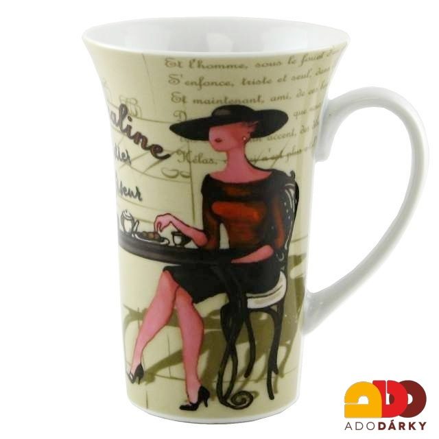 Velký porcelánový hrnek v dárkové krabici, který je dekorován obrazem ženy s "francouzským" pozadím