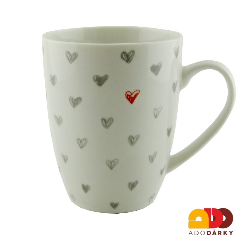 Klasický bílý porcelánový hrnek s potiskem množství šedých a několika červených srdíček. Svým designem snadno zapadne mezi ostatní hrnečky podobného ražení. Hrneček vyniká komfortním ouškem a tenkou vrchní částí, přes kterou se tak příjemně pije.