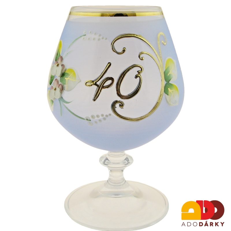 Skleněná číše s číslicí vhodná zejména k oslavě významného životního jubilea je zušlechtěna tradiční novoborskou technikou - ruční malbou skla.