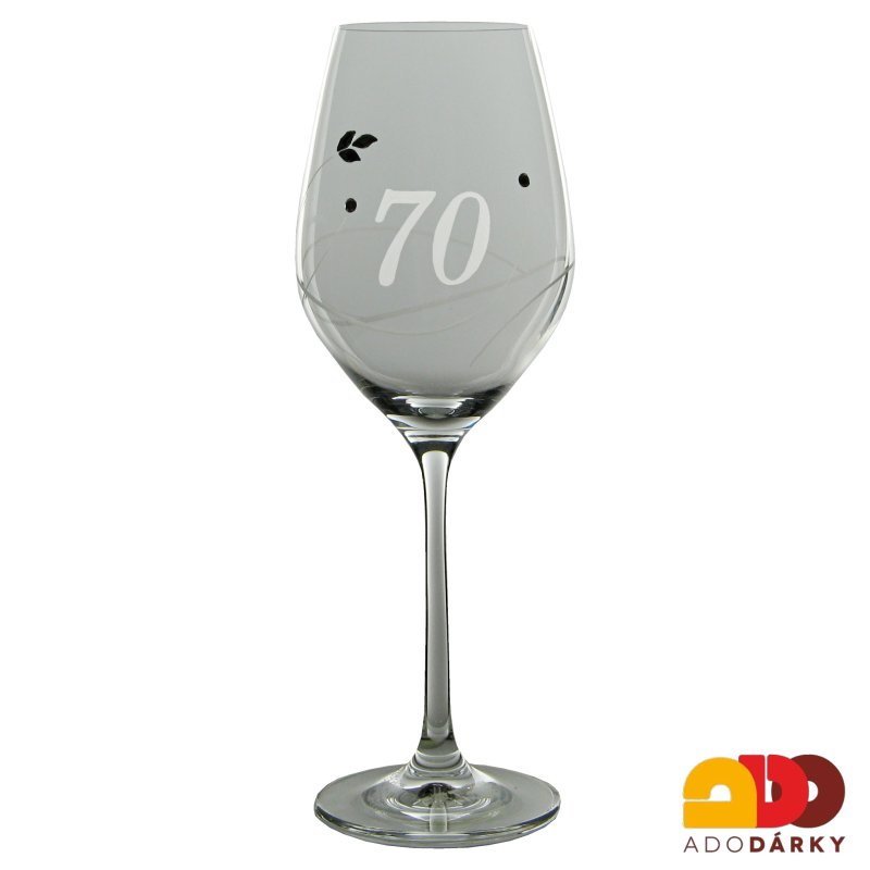 Jubilejní sklenice dekorována broušením a skleněnými komponenty Swarovski. Na sklenici je vybroušena číslovka 70. Sklenice je dodávána v dárkové krabici.