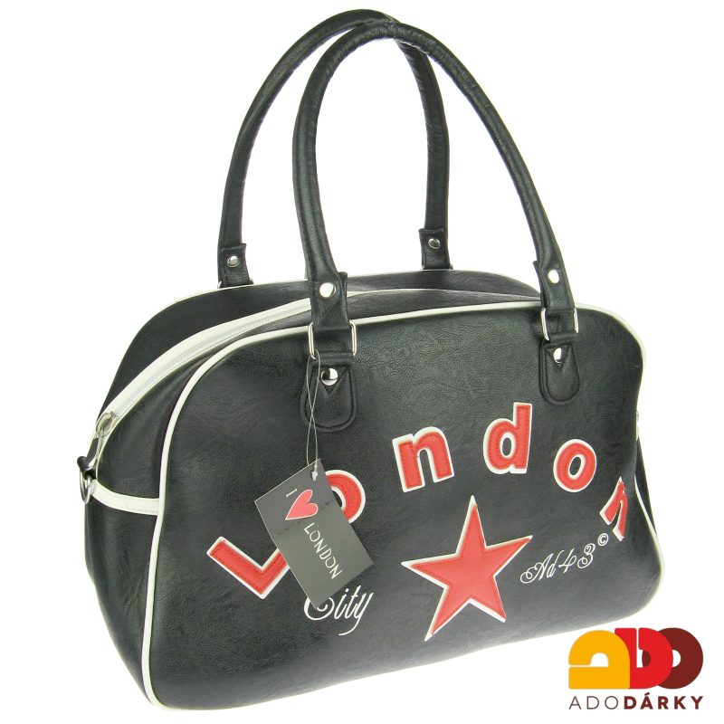 Velká černá kabela z umělé kůže se zapínám na zip a našitým nápisem "London" Vnitřek kabelky je jeden nedělený prostor na jedné straně s kapsou na zip, například na mobil nebo peněženku a na druhé s jednou otevřenou kapsou. Součástí tašky je i ramenní popruh.