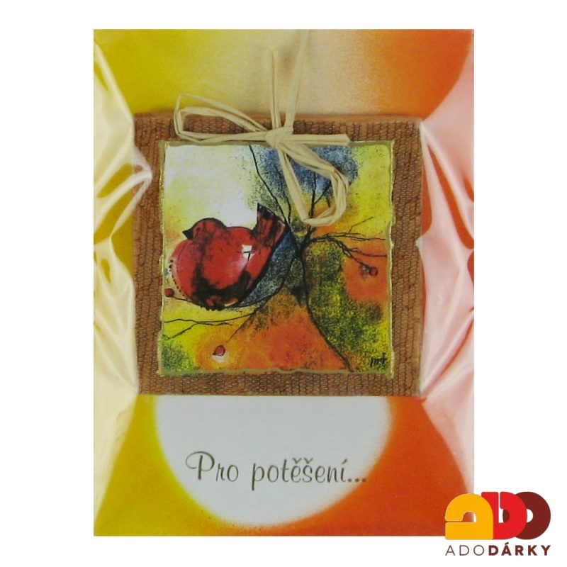 Keramická placka s ručně vytvořeným reliéfem na barevném kartonu pro radost dárce i obdarovaného. Placka je ke kartonu připevněna lýkem, za které lze poté pověsit i na zeď. Keramická placka s červeným ptáčkem - Pro potěšení.