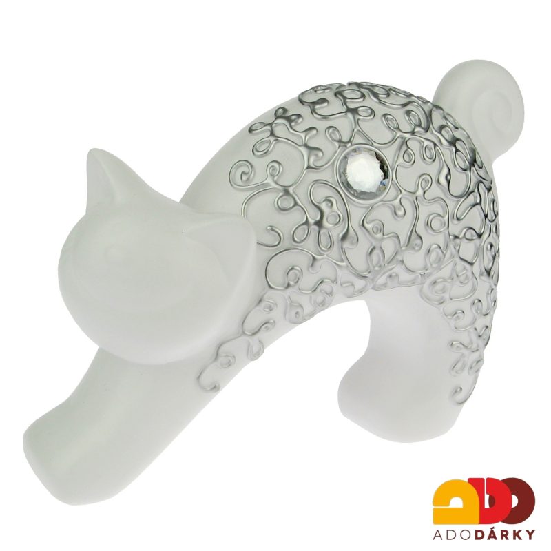 Soška kočky z tenkostěnné keramiky v bílé barvě, je zdobená kamínkem a ornamenty, které vypadají jako drátěné. Je vhodným dárkem nejen pro milovníky koček, ale jedná se i o pěkný designový kousek.