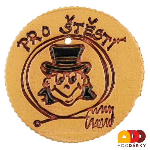Keramické kolečko s vyraženým kominíkem a nápisem "pro štěstí" donese štěstí každému. Výrobek je určen k zavěšení na zeď a v patřičném místě má otvor pro hřebík.