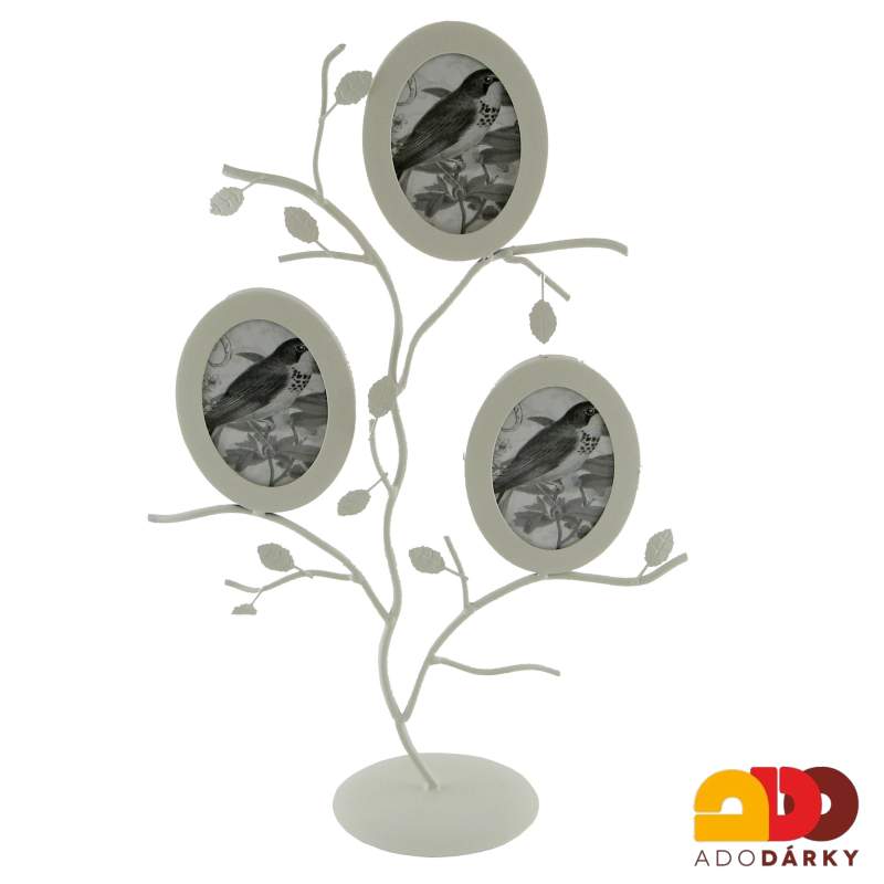 Rámeček na tři fotky v podobě stromu z plechu a drátu, lakovaný na bílo. Rámečky na fotky jsou oválné a instalace fotek probíhá po výjmutí zadního dřevěného víčka, připevněného čtyřmi kovovými petličkami. Designový kousek, který Vám bude připomínat nezapomenutelné okamžiky, nebo blízké osoby, které do něj umístíte.