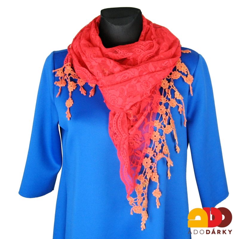 Průsvitná červená šála, delších rozměrů, zdobená vyšitými růžemi a krajkovými okraji. Šál je vyrobený z kvalitního materiálu a kromě zářivých a trvanlivých barev se může pyšnit moderním designem. Ať už si ho vezmete jen tak na halenku nebo jako doplněk svého sladěného outfitu, rozhodně nešlápnete vedle.