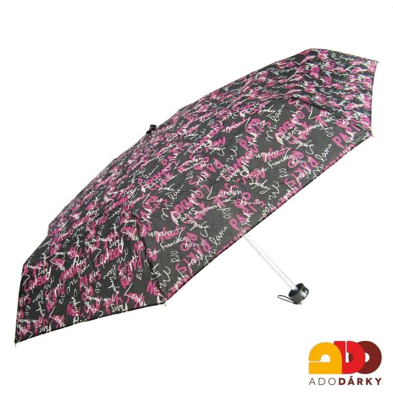 MINI skládací dámský deštník s potiskem růžových a bílých textů na černém pozadí. Otevírání deštníku je manuální. Rukojeť je z plastu a pro komfortnější držení z ní visí šňůrka. Módní dekor dělá z deštníku nejen účelový předmět, ale i stylový doplněk. Svou velikostí se však tento extra malý deštníček vleze opravdu všude.
