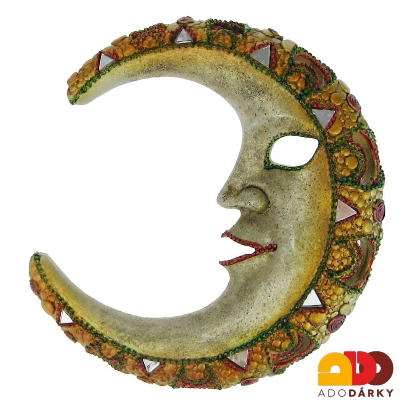 Všemi barvami hrající dekorace ve tvaru měsíce s obličejem, vyobrazená z profilu. měsíc je zdobený barevnými sklíčky a dalšími nakreslenými ornamenty. Veselá dekorace v indickém stylu se hodí téměř do každého tématicky zařízeného interiéru.
