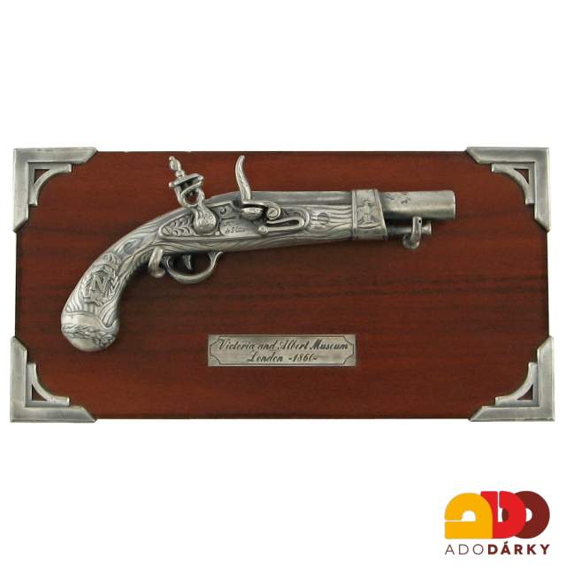 Luxusní miniatura historické pistole s křesadlovým zámkem z šedého kovu na dřevěném podstavci. Ze zadní strany dekorace jsou háčky pro snadné zavěšení.
