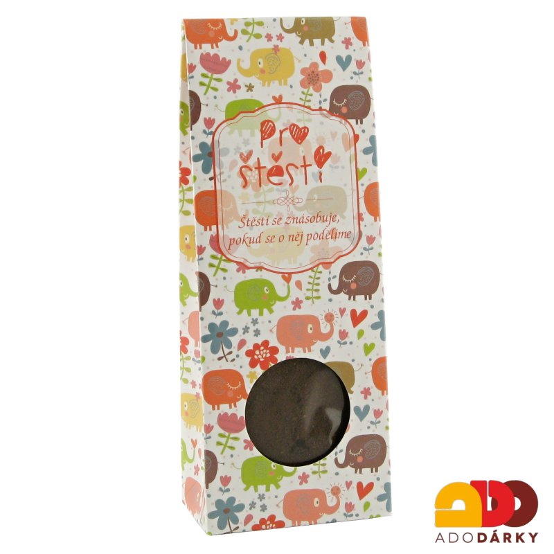 Mletá káva aromatizovaná "Pro štěstí" v dárkovém balení s obrázky slonů. Darujte pohlazení na duši v podobě dárkové mleté kavy, která se hodí téměř pro všechny příležitosti. Vybírejte z široké nabídky různých textů a balení.