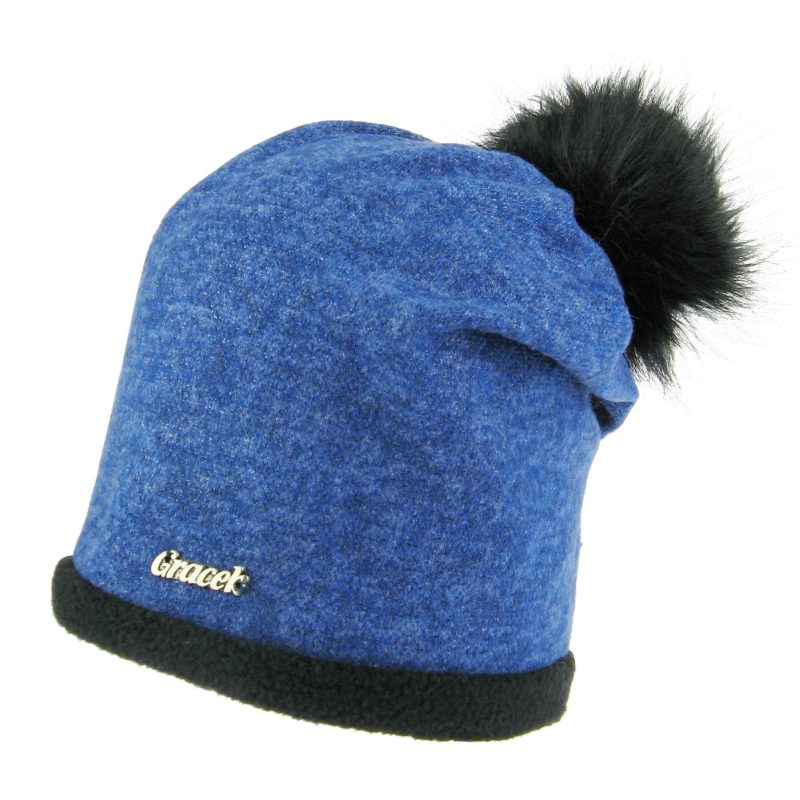 Modrá dámská zimní čepice s podšívkou, černým lemem a chlupatou bambulí. Nedejte zimě šanci a pořiďte si trendy zimní čepice v různých barvách.