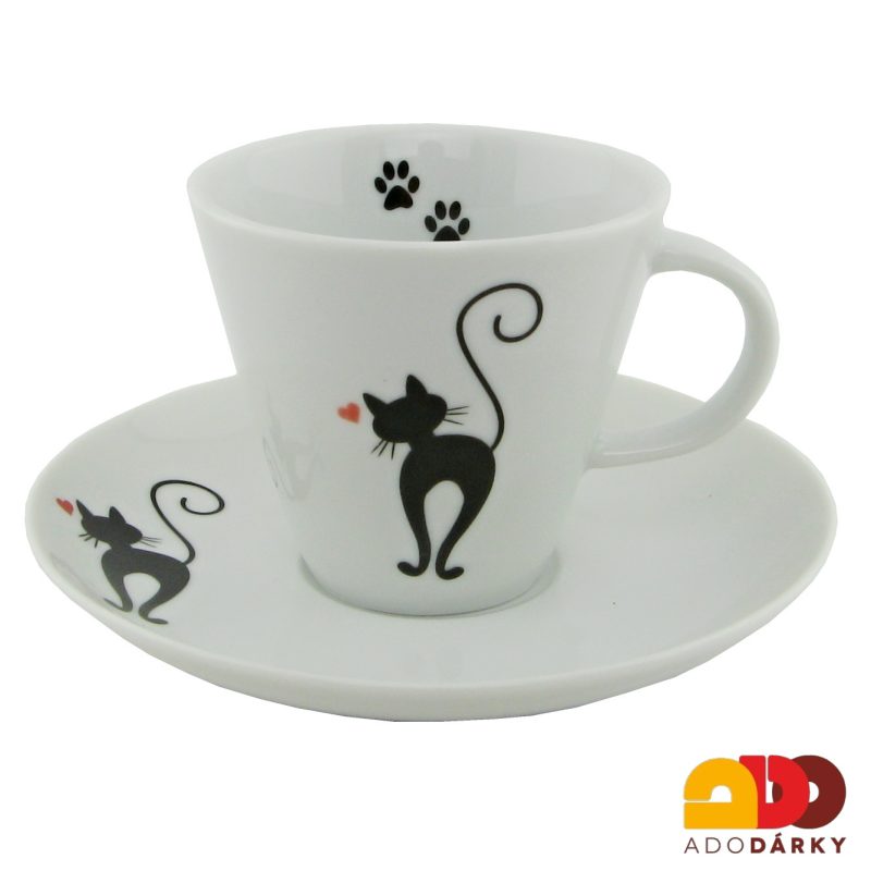 Šálek s podšálkem z bílého porcelánu zdobený obrázkem roztomilé kočky a otiskem její tlapky. Svou veliostí se hrneček vleze pod každý kávovar a nejlépe se hodí na připravu moka kávy. K hrnečkům lze dokoupit i další nádobí ve stejném dekoru, konvičky, mlékovky, cukřenky....a vytvořit si tak doma celou sadu.