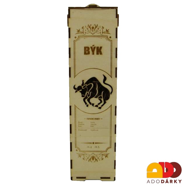 Dřevěný obal na láhev, dekorovaný vyřezáváním a vypalováním. Pro snadnější transport je vybaven uchem. Obal je vhodný na většinu typů lahví a lze darovat jak muži, tak ženě, je proto vhodným darem téměř ke každé příležitosti.