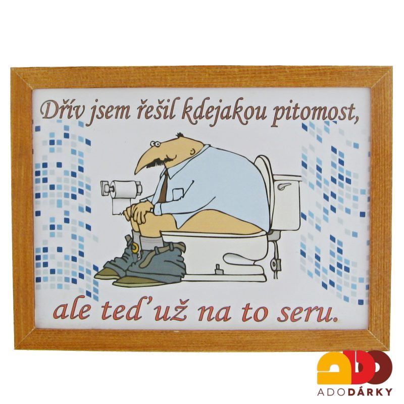 Vtipný obrázek zarámovaný v dřevěném rámu a opatřený očkem ke snadnému pověšení na zeď. Každý obrázek se věnuje jednomu z aktuálních témat a převádí ho do vtipné roviny. Obrázky jsou vhodné jako dárky s nadsázkou pro lidi oplývající smyslem pro humor.