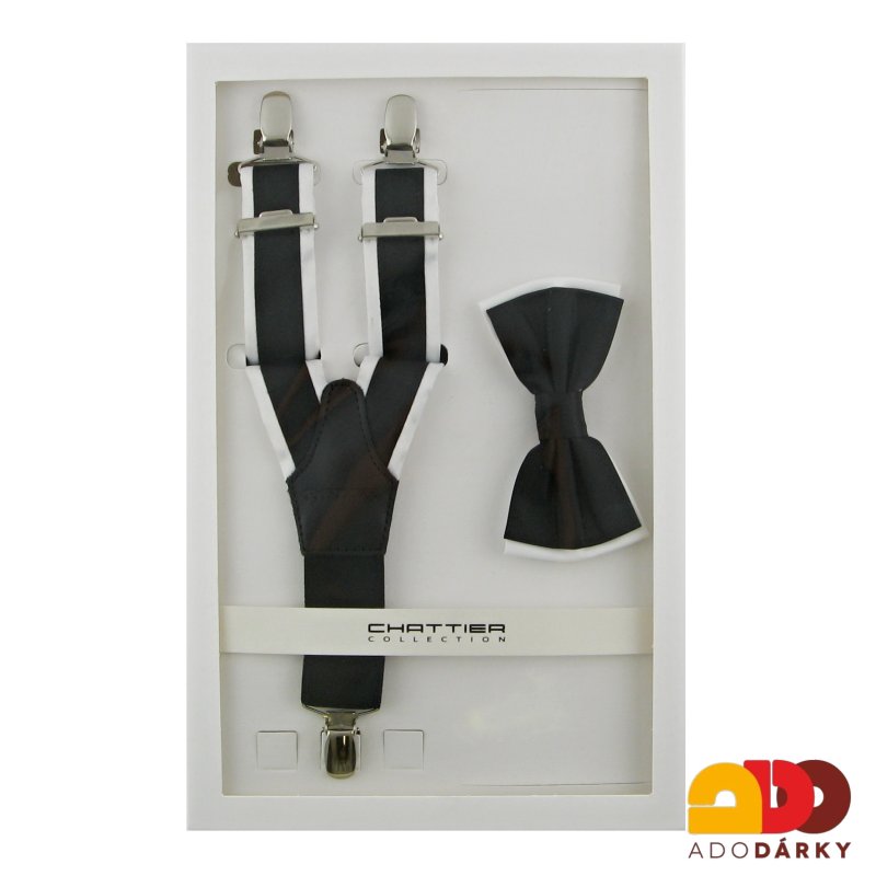 Pánské kšandy se vrací opět do módy a jejich úkolem zdaleka není pouze přidržení padajících kalhot. V současné době se jedná o originální pánský doplněk se vším všudy. Díky tomuto setu Vám odpadá starost, jak sladit kšandy a motýlka dohromady. Kšandy jsou nastavitelné pro každý typ postavy, díky spodnímu elastickému dílu, který je s šlemi spojen koženým středem. Uchycení na kalhoty je poté pomocí kovových žabek. Nebojte se sundat sako a zaujmout!