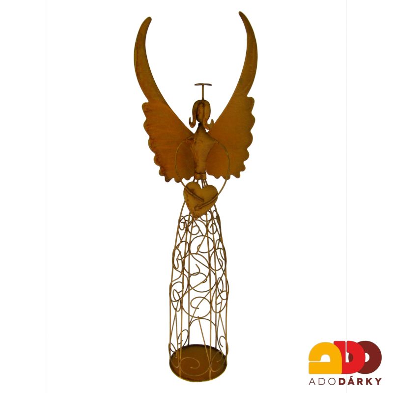 Plechový anděl se srdcem a s prostorem na svíčku. Anděl je designově patinován rzí, poté však přelakován, takže se nemusíte bát, že byste se o něj zašpinili. Zajímavá dekorace do každého moderního bytu.