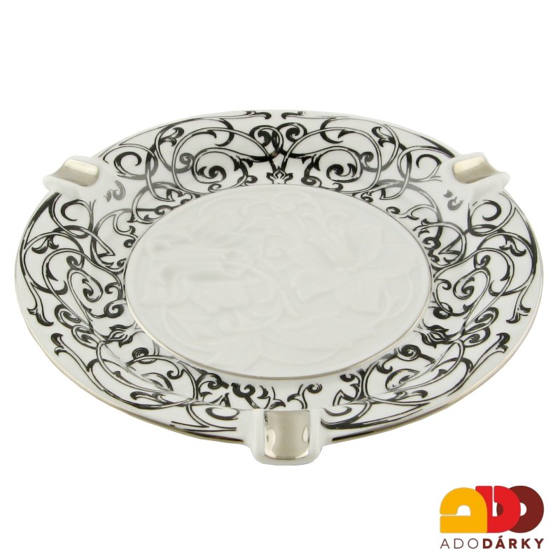 Porcelánový popelník jako designový skvost na Vašem stole? Proč ne? Popelník zdobený pravým stříbrem od porcelánového studia Leander je svým způsobem tak krásný a netradiční, až ho je téměř škoda používat. Popelník je zdobený černými trnovými motivy, které vhodně dopňují tři odkládací plošky na cigarety, glazované pravou stříbrnou glazurou.