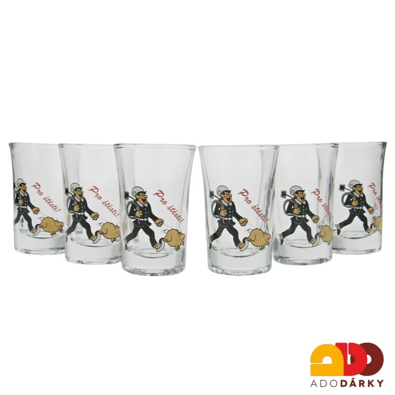 Sada 6 štamprlí neboli odlivek na slivovici, popřípadě jiný destilát je zdobena obrázky Kominíka vedoucího na provázku prasátko štěstí. Jedná se o skvělý dárek nejen pro muže. Všech 6 štamprlí je zabaleno v dárkové krabičce.