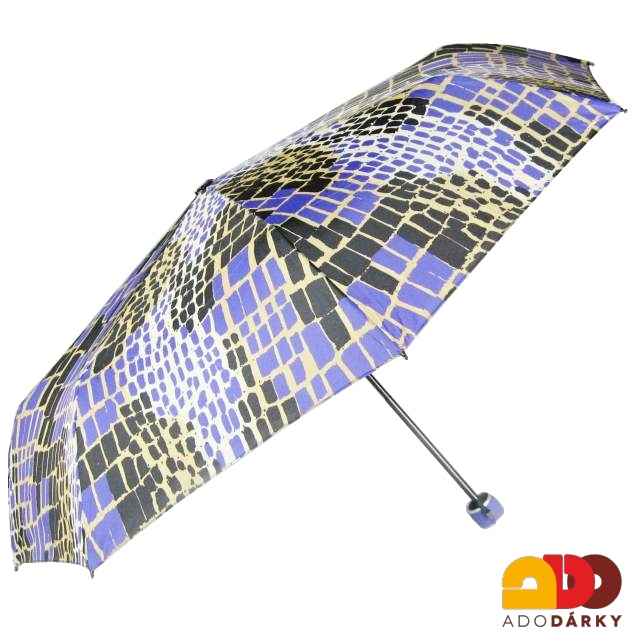 Kvalitní skládací dámský deštník s fialovo - černým potiskem. Osm drátěných paprsků dodává deštníku potřebnou stabilitu i v silnějším větru. Otevírání deštníku je manuální. Rukojeť je z pogumovaného plastu a pro bezpečnější nesení z ní visí šňůrka. Módní dekor dělá z deštníku nejen účelový předmět, ale i stylový doplněk.