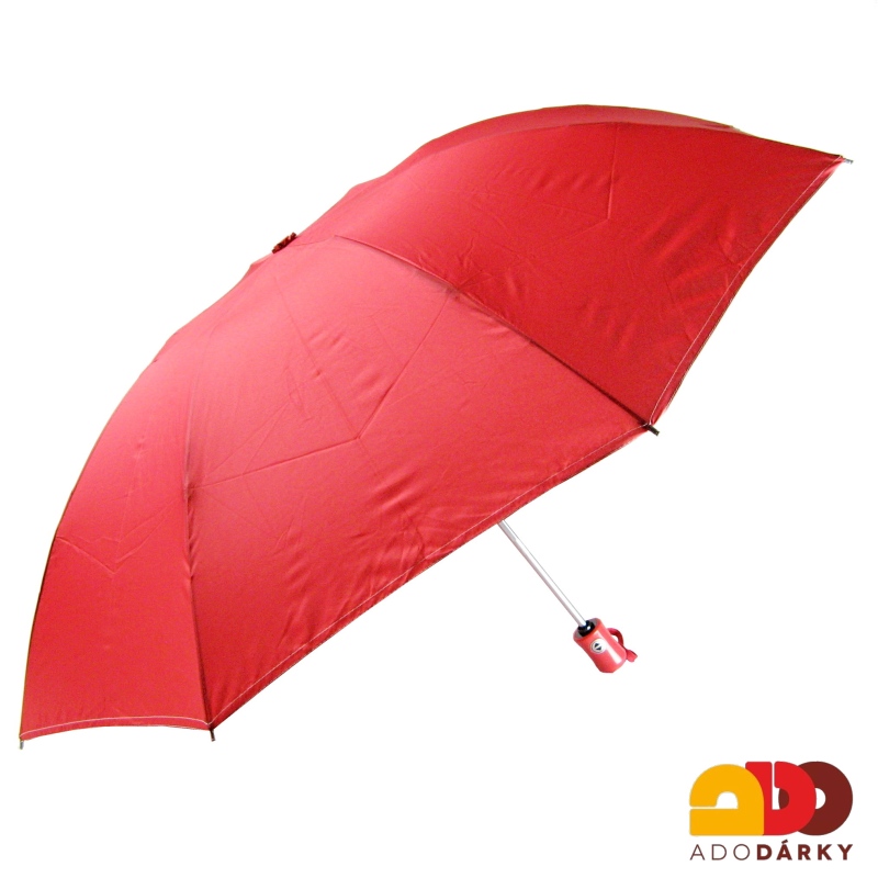 Skládací deštník s červeným potahem. Otevírání deštníku je automatické, na tlačítko, zavírání poté také. Počet osmi drátěných paprsků zajišťuje deštníku stabilitu i v silnějším větru. Rukojeť je z plastu se šňůrkou k bezpečnějšímu držení.
