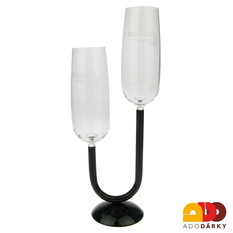 Netradiční sada dvou sklenic na šampaňské, bez stopek. Skleničky jsou uchyceny ve speciálním kovovém držáku a proto je nelze jen tak odložit. Vtipná situace na dosah ruky.
