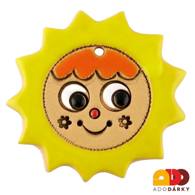 Malé keramické sluníčko s veselým úsměvem, glazované zářivýma barvama.