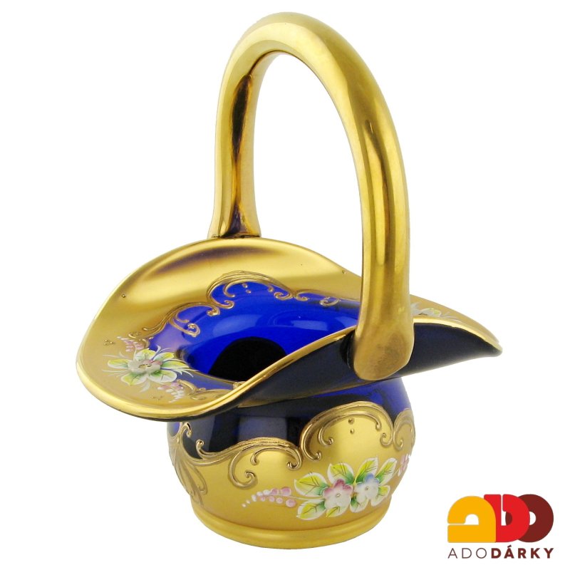 Ručně dělaný smaltovaný košík od předního českého výrobce skla Bohemia Crystal, zdobený 14K zlatem. Košík je z modrého skla, z venkovní strany zdobený plastickou dekorací květinových lístků a zlatých květinových ornamentů. Zpracování je precizní a svou kvalitou patří na první příčky v mezinárodním srovnání.