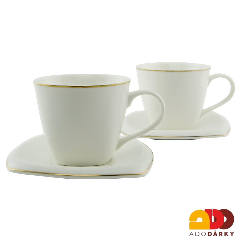 Dva porcelánové hrnečky s hranatými podšálky v dárkové krabici. Hrnečky mají designové ouško a jsou dekorovány pouze tenkou zlatou linkou po obvodu.