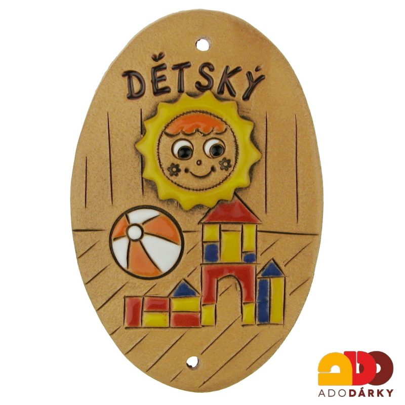 Štítek na dveře pokoje samozřejmě nemusí viset přímo na dveřích, ale třeba i vedle na zdi... Nahoře a dole jsou dírky pro hřebíčky nebo šroubky, popřípadě je možné štítek přilepit lepidlem. Štítek je z keramiky a je glazován veselými barvami - jedná se o ruční práci a každý kus je originál.