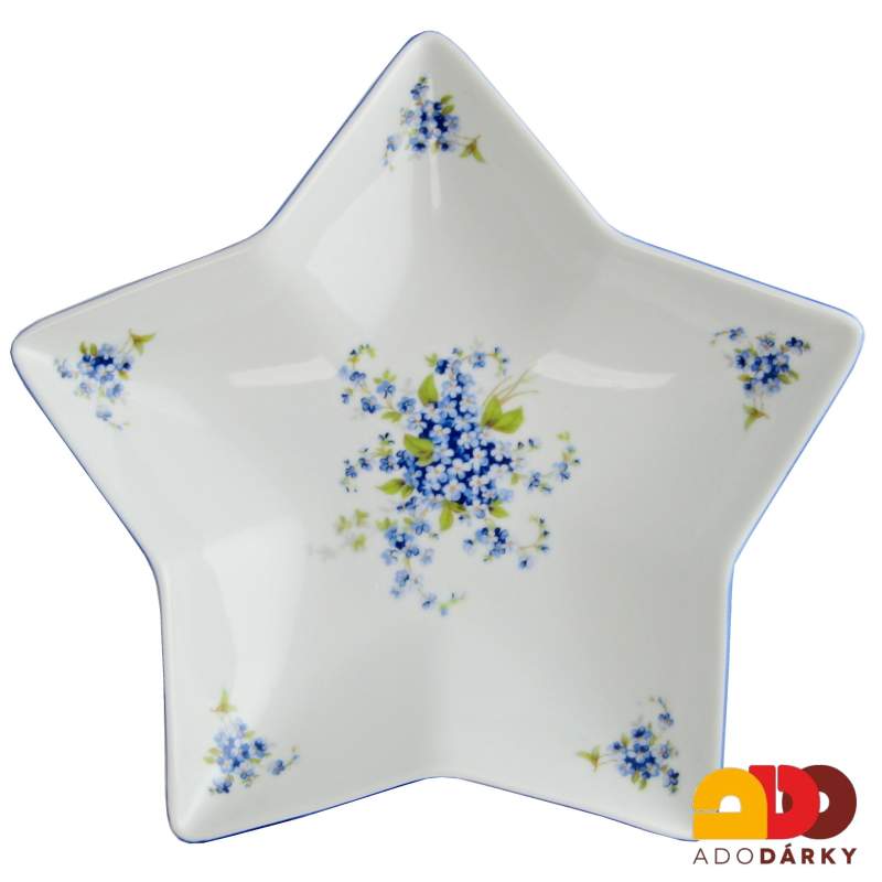 Porcelánový tác ve tvaru hvězdy zdobený pomněnkami.