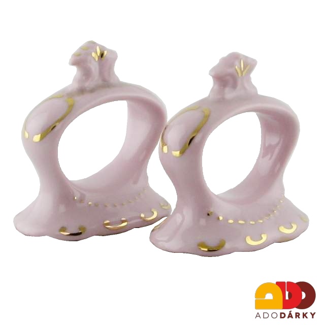 Dva ubrouskovníčky vyrobené z růžového porcelánu, ručně zdobené 14K zlatem. Porcelán je vyráběn českou porcelánkou Leander s více než stoletou tradicí a vlastními výrobními postupy.