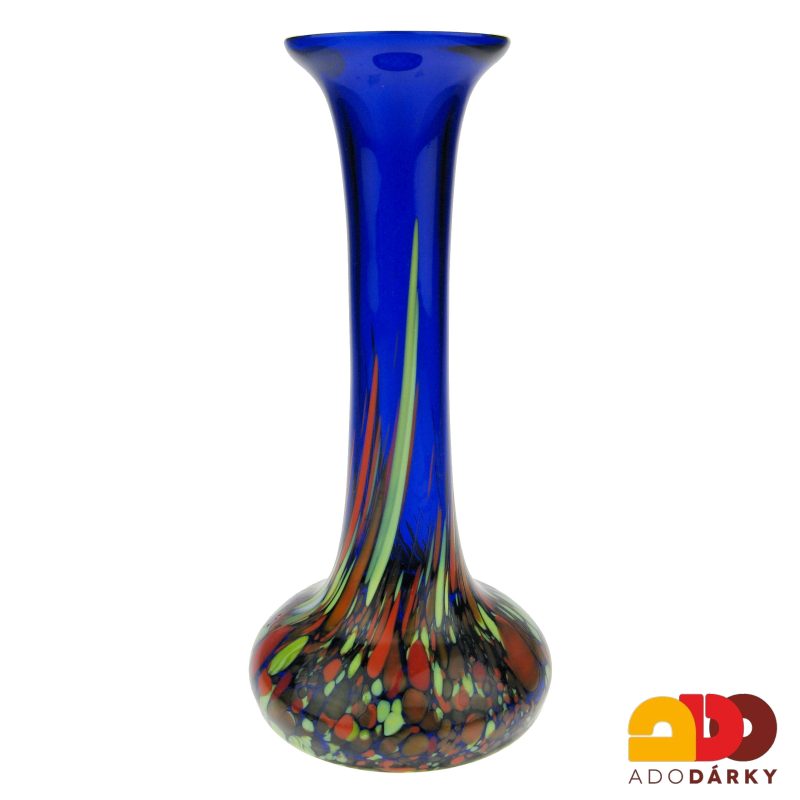 Skleněná vysoká váza z modrého skla dekorovaná od spodní strany do půli stříkanci červené a zelené barvy. Ručně vyrobená váza je produktem sklárny Karolinka, špičkou ve výrobě dekorativního a užitkového skla.