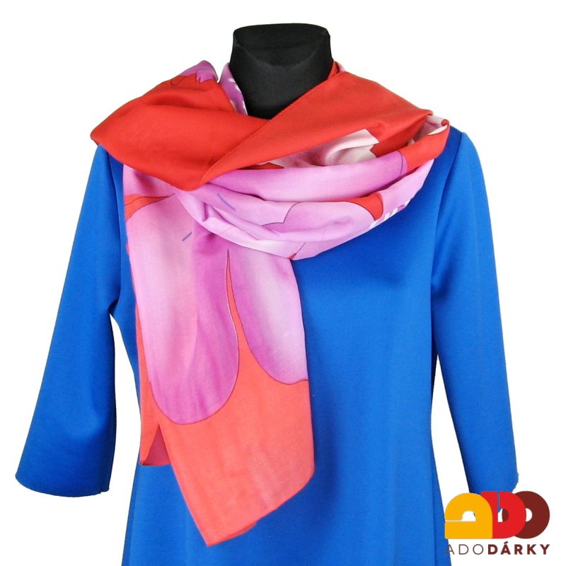 Letní dámská šála, větších rozměrů, zdobená fialovými a zelenými květy na červeném podkladu. Šál je vyrobený z kvalitního materiálu a kromě zářivých a trvanlivých barev se může pyšnit moderním designem. Ať už si ho vezmete jen tak na halenku nebo jako doplněk svého sladěného outfitu, rozhodně nešlápnete vedle.