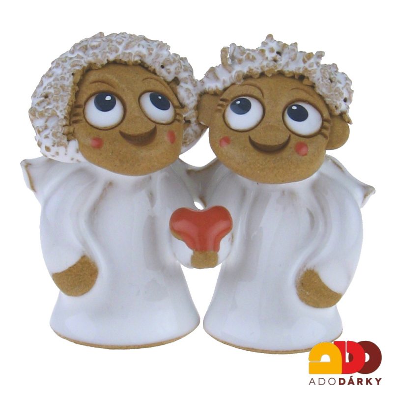 Keramická figurka dvou andělů - kluka a holky se srdíčkem ve spojených rukách je vyrobena z keramiky a poté glazována. Každý anděl je díky ruční výrobě originál, každý osloví někoho jiného. Třeba čeká právě na Vás.