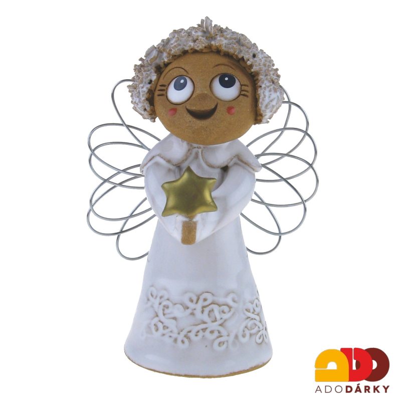 Soška anděla se sepnutýma rukama ve kterých drží hvězdičku je vyrobena z keramiky a poté glazována. Anděl má křídla vyrobena z drátů a na spodní straně "vytláčený" lem, takže šaty se tváří jako krajkové. Každý anděl je díky ruční výrobě originál, každý osloví někoho jiného. Třeba čeká právě na Vás.