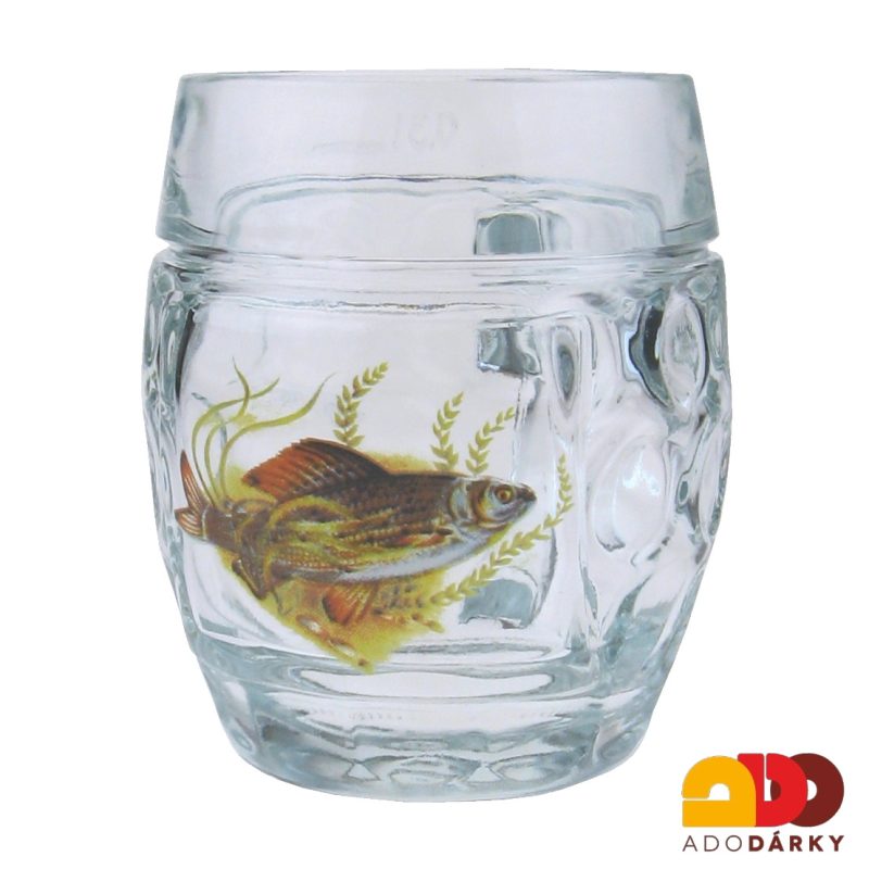 Baňatá sklenice na pivo s uchem - menší, tedy třetinka - má na přední straně obrázek ryby. Jedná se o dárek nejen pro muže, ale i pro rybáře.