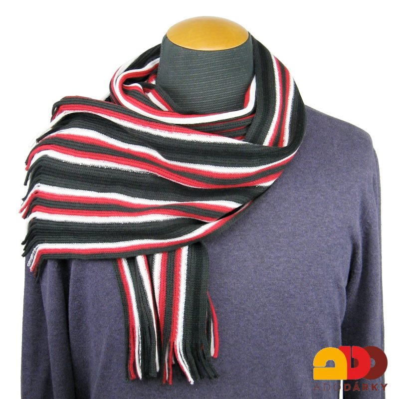 Klasická pánská zimní šála v černé barvě, ozvláštněná barevnými proužky, pletená jemným okem, opatřená na obou koncích krátkými třásněmi. Připravte se na větrný podzim a zimu a nepodceňujte počasí. S touto moderní šálou nešlápnete vedle, hodí se totiž téměř ke každému outfitu, ať už saku, kabátu, nebo třeba jen svetru.