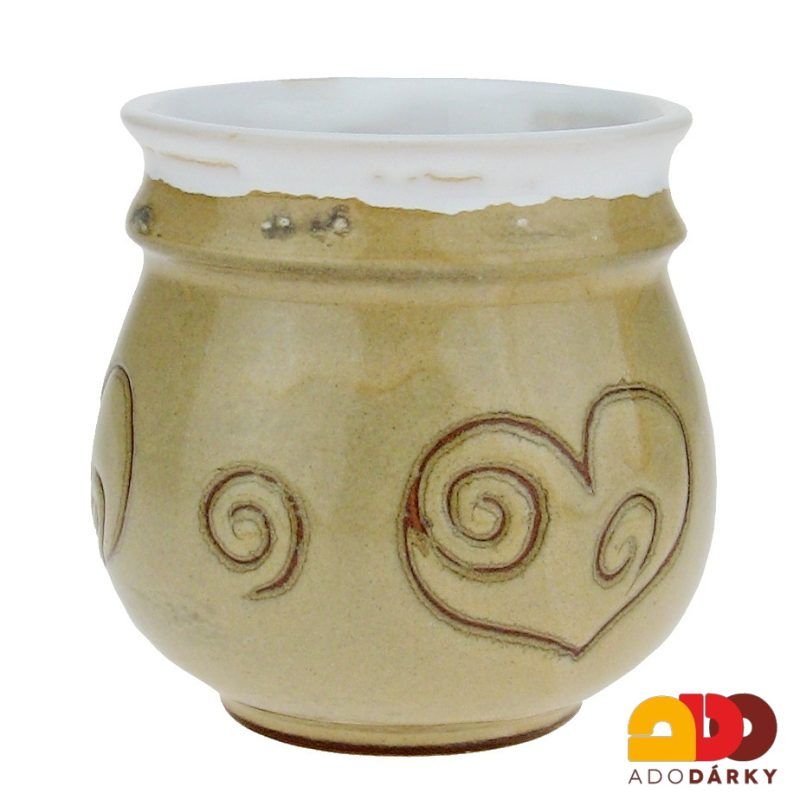 Keramická cukřenka z hnědé hlíny, dekorována kolem dokola ornamenty se srdíčky a širokým bílým lemem. Funkční kousek na každý stůl.