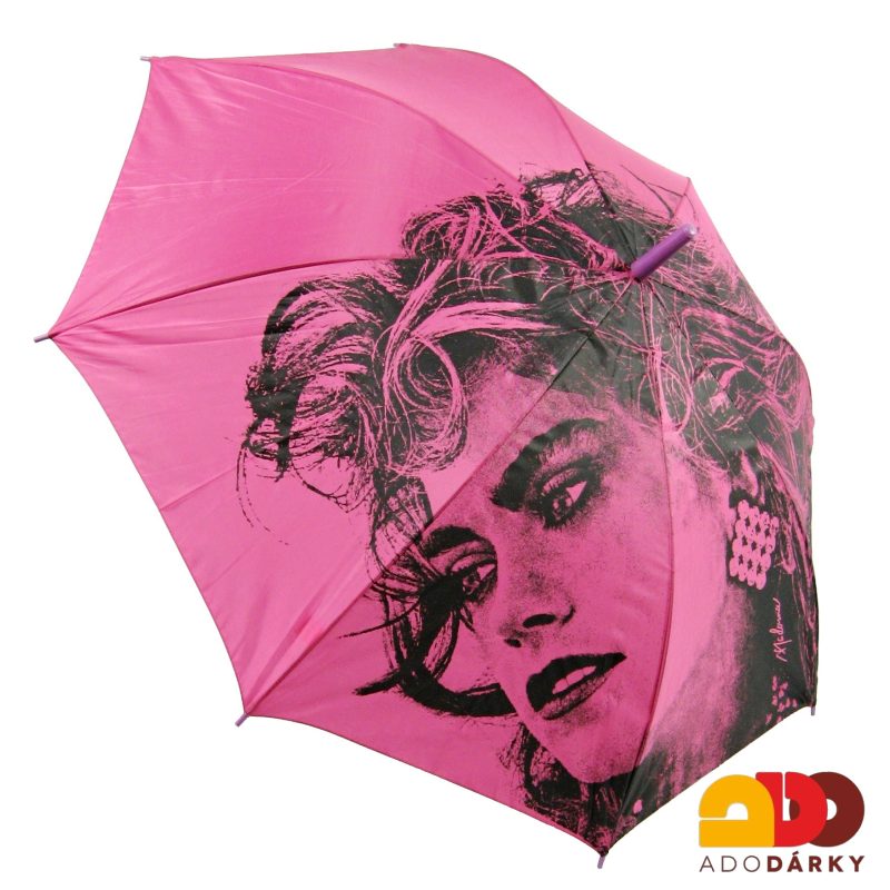 Originální dámský holový deštník s růžovým potahem zdobený potiskem tváře sympatické ženy. Otevírání deštníku je poloautomatické a silná pružina zajistí jeho okamžité roztáhnutí, skládání je poté ruční. Rukojeť je plastová, standartně zahnuta, špička deštníku je také plastová.
